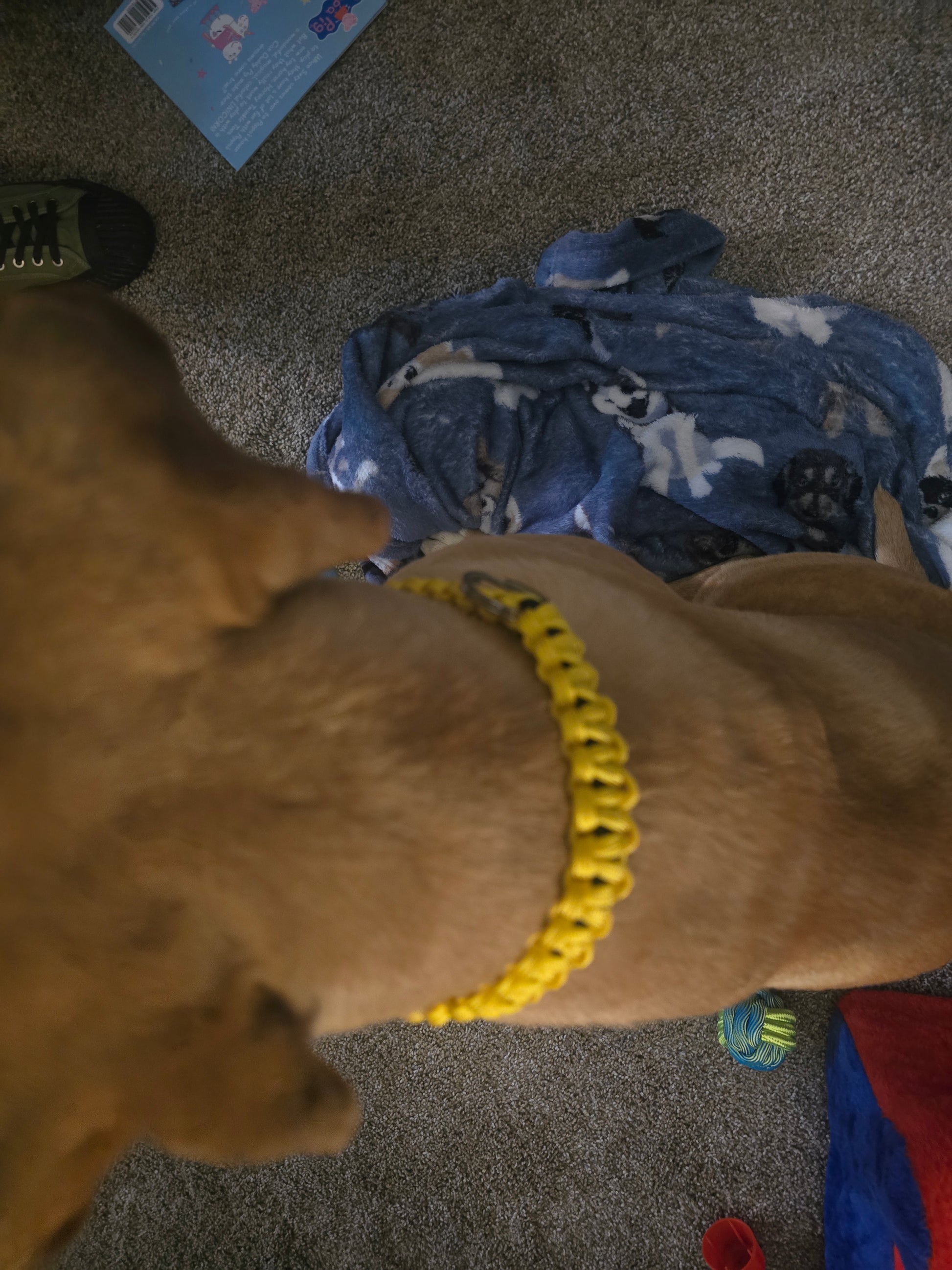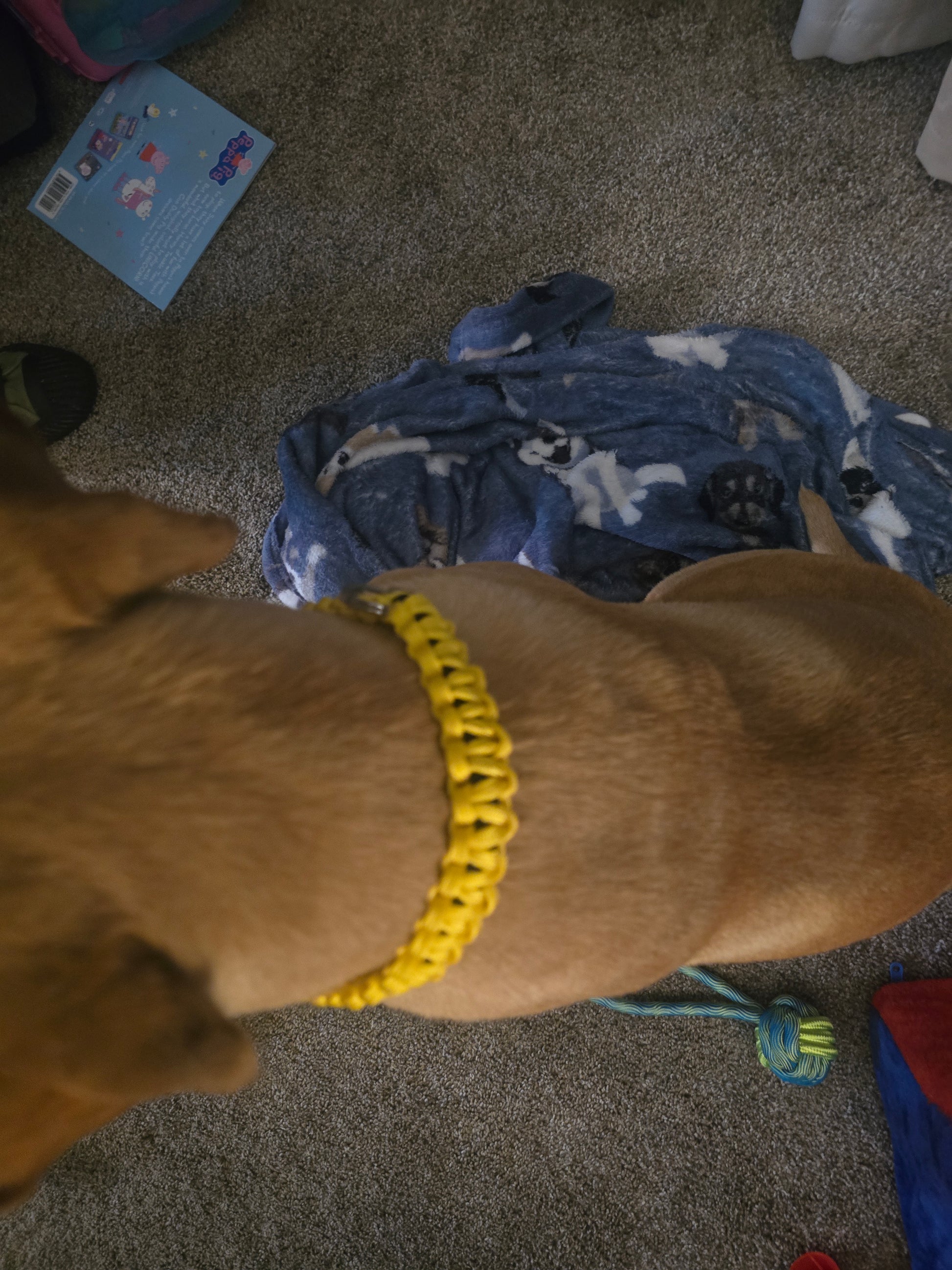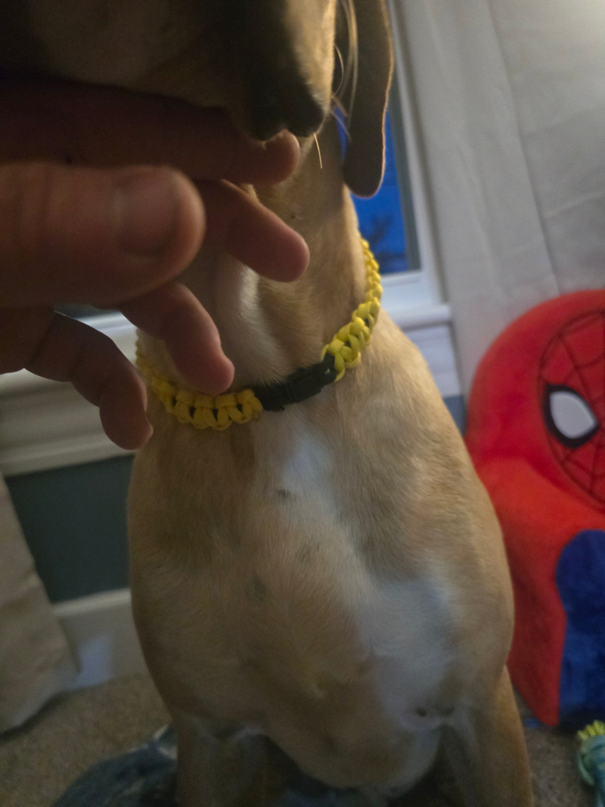Once worn by the hounds of the Bonebound Warlords, this collar binds loyalty through marrow and myth. Yellow cord echoes the sun-bleached bones of ancient beasts.