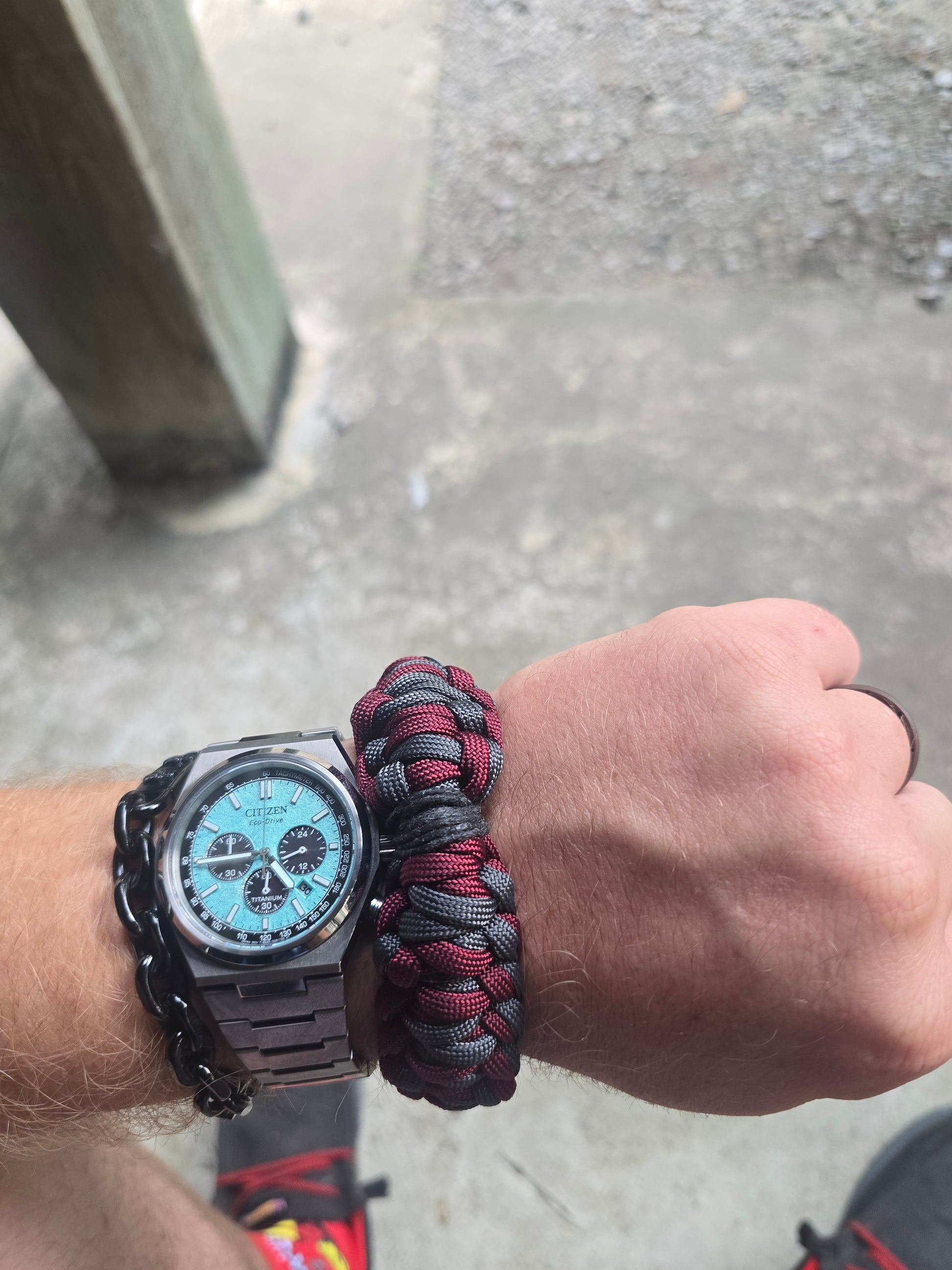 Handwoven by the Wandering Warlock, this Cobra Spine bracelet fuses modern grit with ancient ritual. USA-made 550 paracord in stealth grey and burgundy coils like vertebrae around the wrist, while a hemp cord wrap binds the center with earthy defiance. It’s a relic for those who walk the line between civilization and chaos — a wearable spine for the myth-bound.